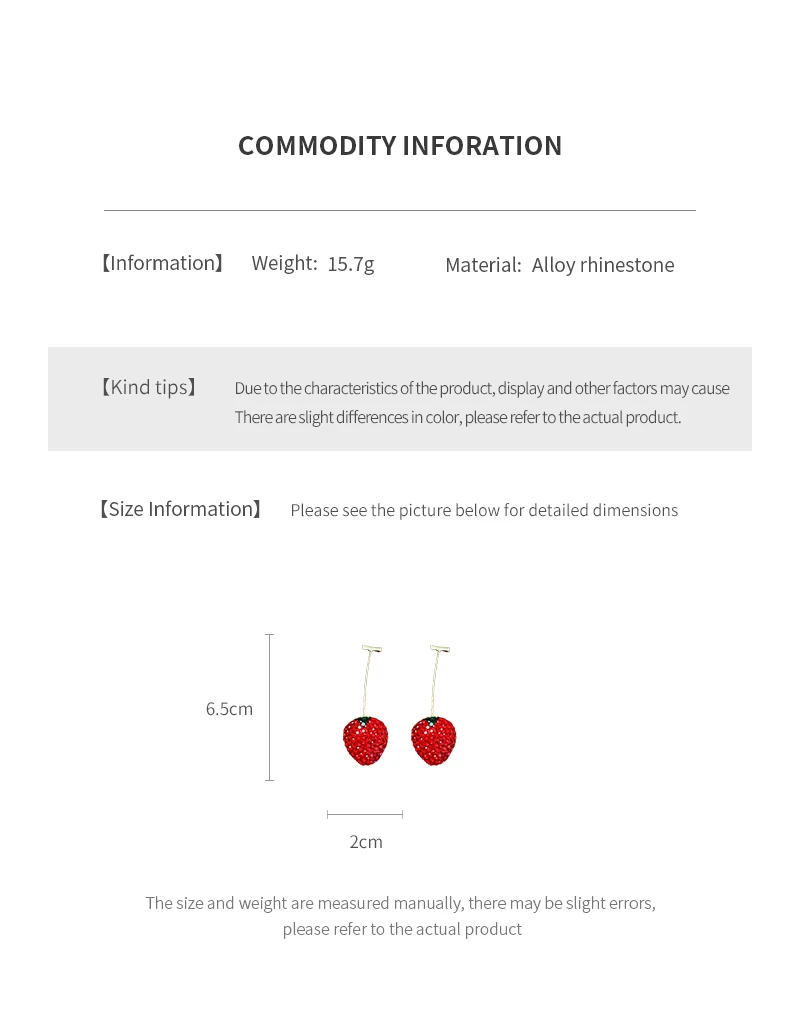 2 Pcs Rhinestone Strawberry Earrings for Women Sweet Lovely Girl Heart Drop Earrings Temperament Light Luxury Jewelry Wholesale
