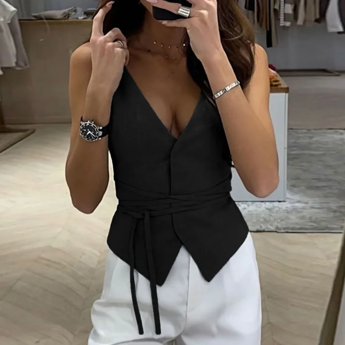 Womens 2024 Summer Fashion Casual Vest British Style Solid Frenulum V Neck Tank Tops