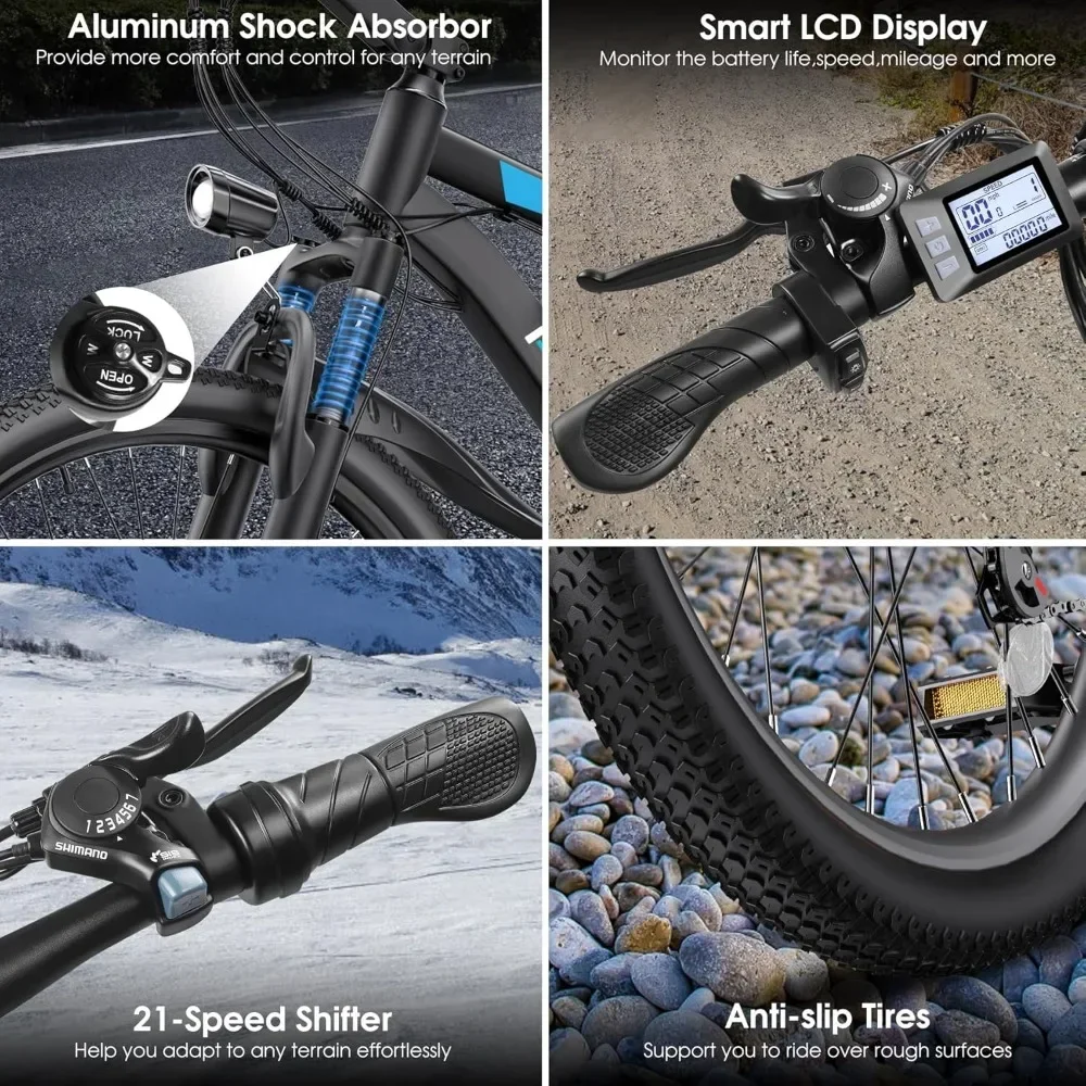 - Safe Ebike Configuration: 26 inch electric bike for adults adopts a lockable front shock absorber to smooth out bumps, rocky and uneven terrain. The added fenders protect your bike away from mud and water. The smart LCD display provides real-time data, including battery life, current speed, mileage, pedal assist level and more. Other reliable e-bike designs like mechanical dual disc brakes, LED headlight and electric horn system and reflectors, safeguard your safety.