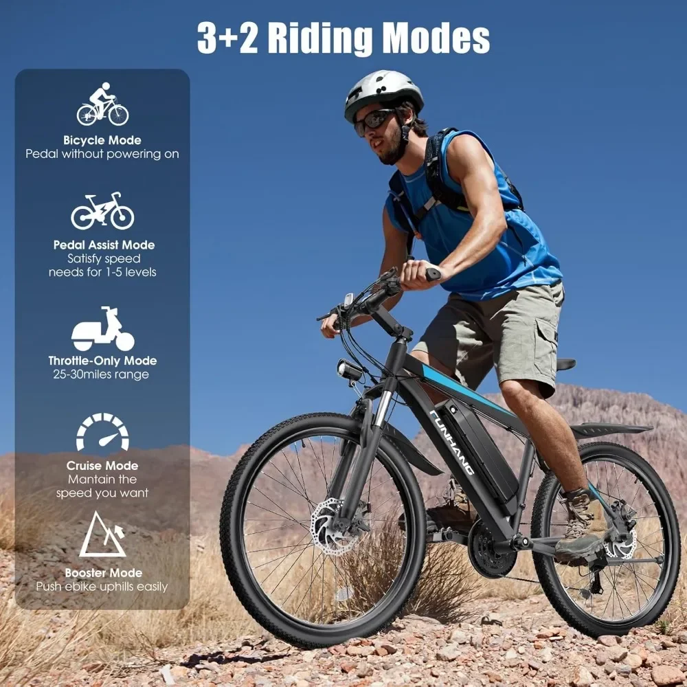 - Customized Riding Experience: The electric mountain bike features 5 working modes and 5 pedal assist levels. Throttle Ebike & Assisted Bicycle & Normal Bike & Cruise Mode & Booster Mode for your option. Kicking in 1-5 PAS levels or twisting the throttle will make your ride a breeze. Booster Mode helps you push your bike effortlessly. Combined with the 21-speed shifting gears on the adult electric bicycle, you can customize your speed needs and riding style for any biking terrain.