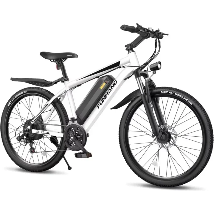 - Durable Frame & Adjustable Handlebar/Seat: Funhang EB-M1 model is made of an aluminum alloy frame for enhanced solidity and durability, anti-slip 26″ tires for a better grip in extreme conditions. The upgraded handlebar stem and comfy seat can be easily adjusted to your preferred riding positions. This electric bicycle weighs 49.6 lbs and comfortably suits adult and teen riders between 5’3″-6’1″ tall and up to 300 lbs/135kg.