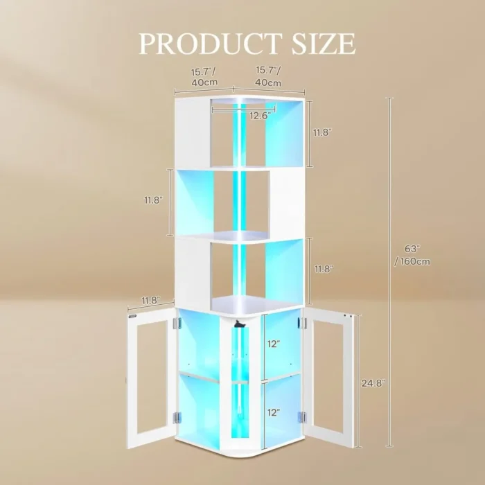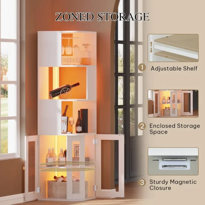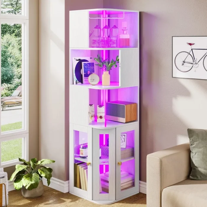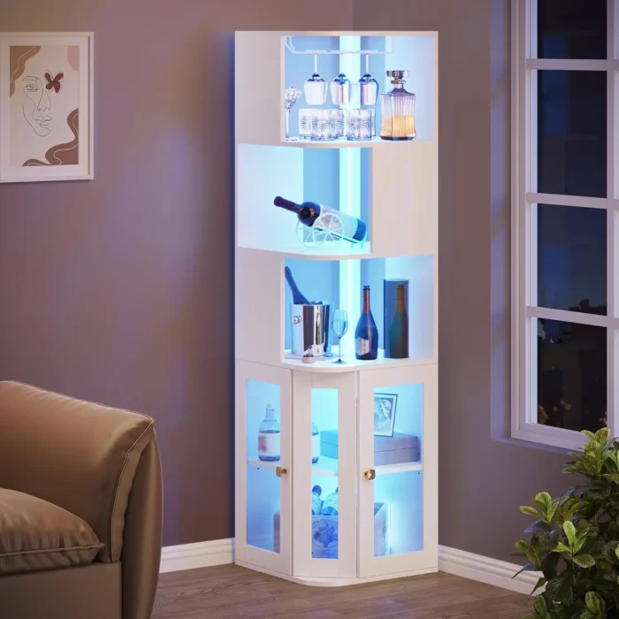 - Stylish Design: The unique scattered shelf design adds a modern flair to your space, whether our LED corner wine cabinet in the dining room, living room, or kitchen. Its angled structure fits seamlessly into any corner, maximizing your room’s potential