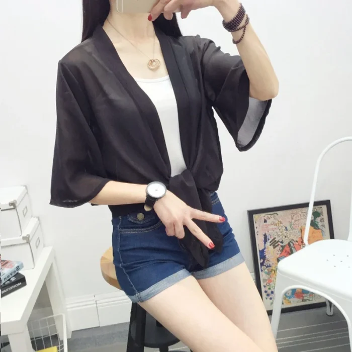 DAXIN Chiffon Kimono Cardigan Casual Half Sleeve Loose Black Women Blouses Shirts Plus Size Summer Women Tops Outerwear F