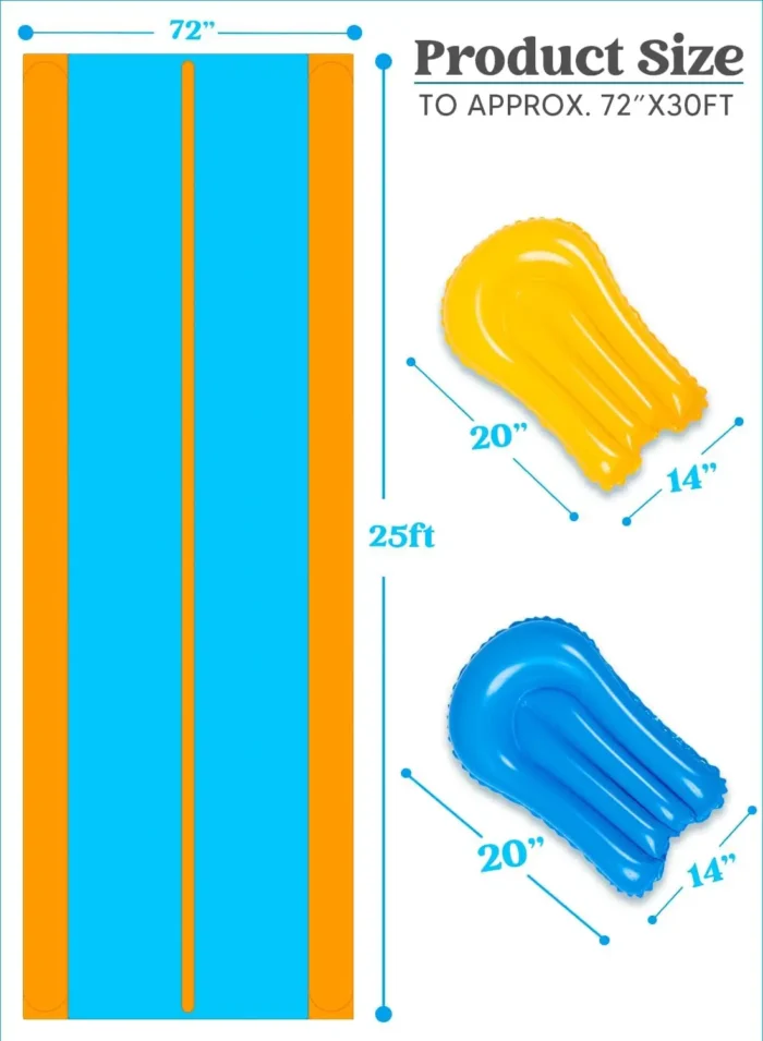 1. INCLUDES. Our Super Double Water Slide includes 25ft x 6ft Super Water Slide, 2 inflatable boards, 21.7″ x 16.5″ , built in middle sprinkler, 6 ground stakes , Featured with inflatable side air column for extra protection
