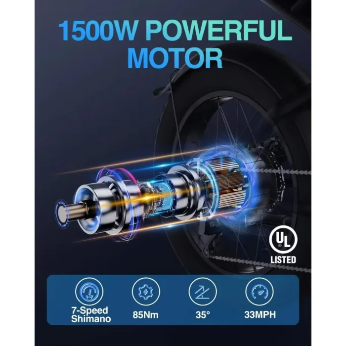 - 【POWERFUL AND FAST】 – Prepare for an exhilarating ride with our e bike designed for adults. It is equipped with a robust 1500W motor. With an impressive 85Nm torque, it offers excellent climbing strength and effortlessly accelerates to a top speed of 32MPH. Experience the freedom and excitement as you feel the wind in your hair, making every ride an adventure.