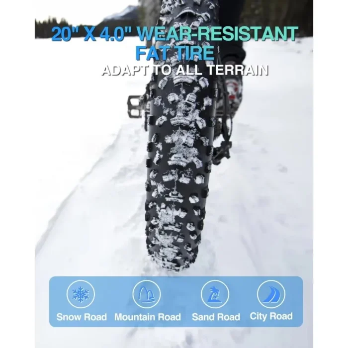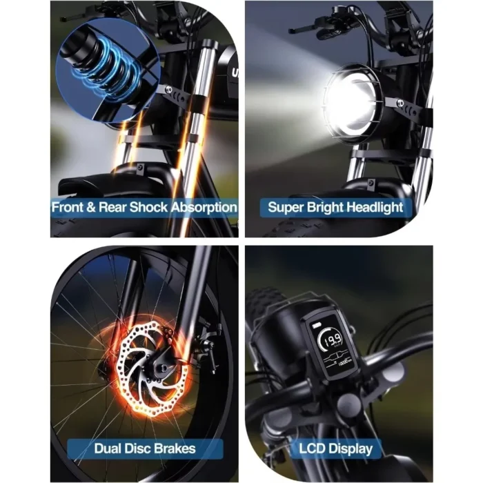 Bright LED Headlight & Tail Light & Turn SignalThe LED headlight provides illumination for nighttime riding, while the horn alerts others to your presence. The taillight makes you visible from the rear, turn signals indicate the intended movement of the bicycle, and the rearview mirrors enhance your overall visibility and safety on the road. | Dual Disc BrakesDual Mechanical Disc Brake Reliable dual mechanical disc brake system is equipped. Works great in a short time. Enjoy the fast speed ebike with safety. | Convenient luggage rackIt allows riders to easily carry various items such as bags, backpacks, helmet,groceries, or even small packages,enhancing the practicality and utility of the electric bicycle for commuting,or leisurely rides. | 20″*4″ Snow Fat TiresWith 20″*4.0″ puncture-resistant fat tires, this motorcycle effortlessly tackles grass, dirt, sand, snow, and gravel. Ride confidently, knowing that these durable tires offer exceptional traction and stability on any challenging terrain. |