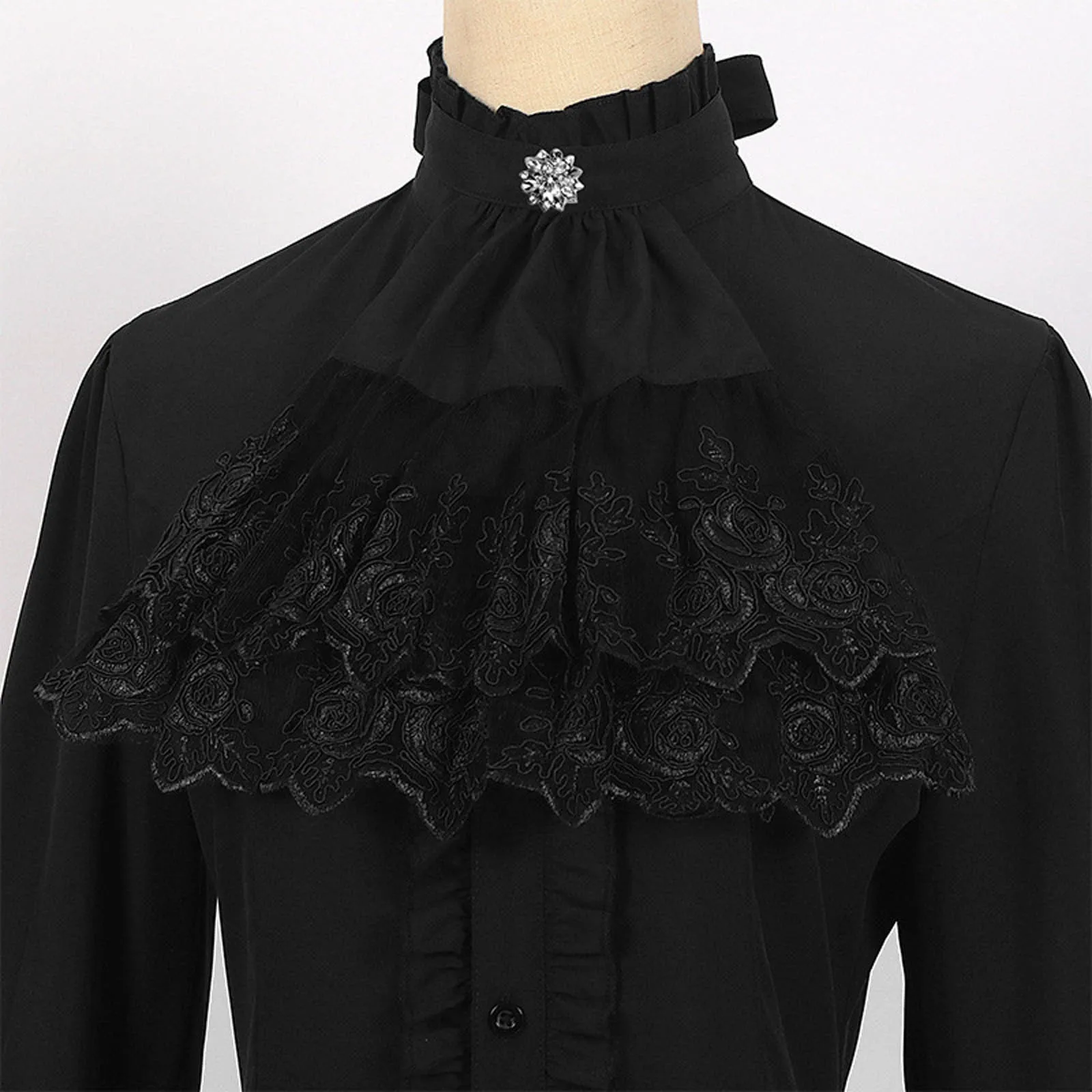 Elegant French Style Solid Shirt For Women Stand Flare Sleeve Lace Embroidery Ruffles Bandage Design Gothic Black Shirts Top