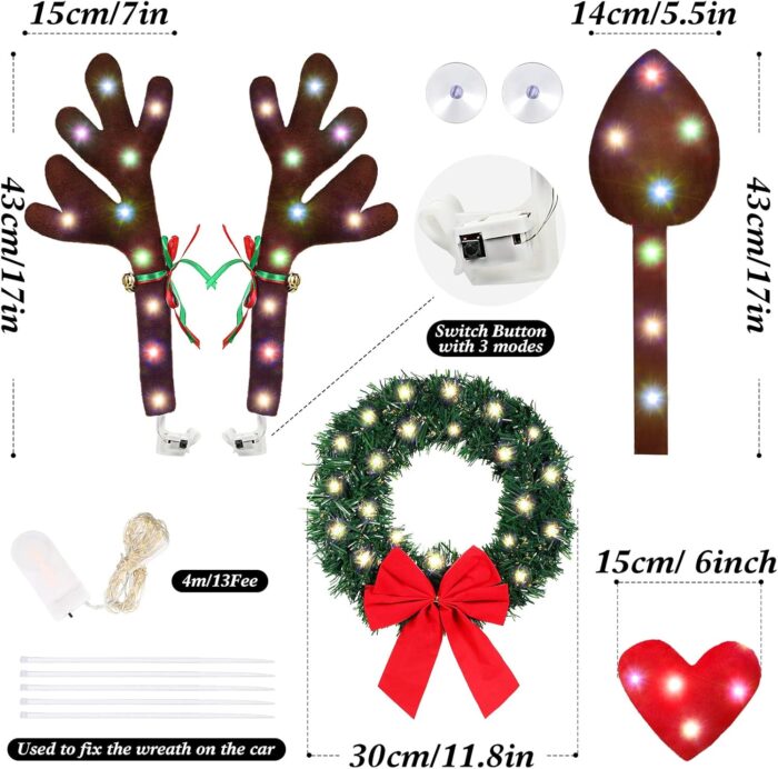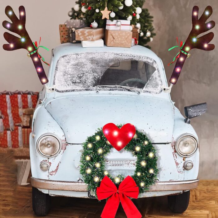 The Christmas Reindeer Antlers Car Kit features two sturdy antlers that light up with vibrant LED bulbs. These lights flash cheerfully, capturing the joyful essence of Christmas and spreading holiday cheer to everyone on the road. Whether you’re driving through a neighborhood Christmas parade or simply heading to a holiday party, the glowing antlers turn heads and spread smiles.