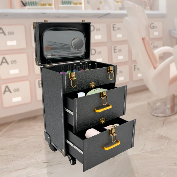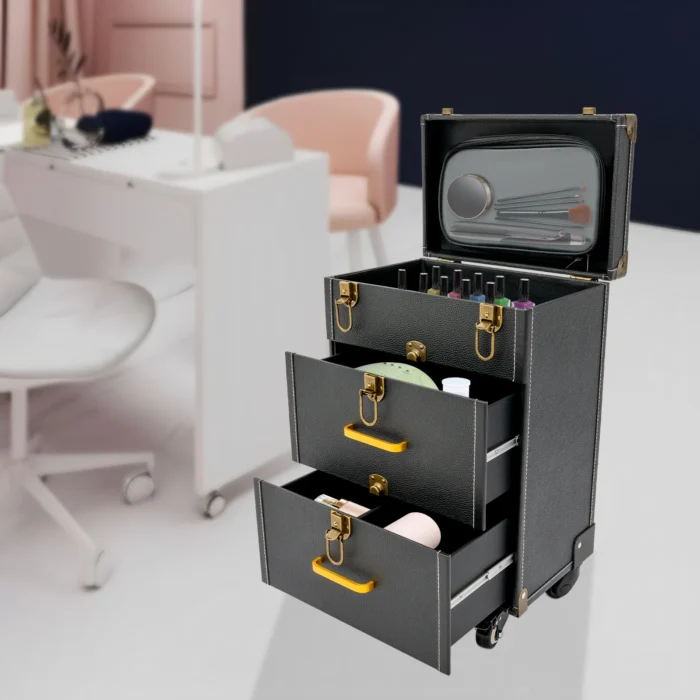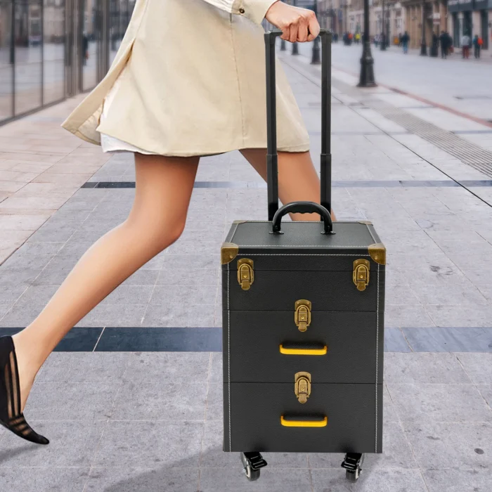 A good makeup case is essential for makeup artists. The rolling makeup case is made of high-quality materials, sturdy and durable. The large capacity design allows you to partition and store different cosmetics, hair tools, and more. With the minimalist style, universal wheels, retractable pull rod, and comfortable handles, it makes your make-up work more convenient!